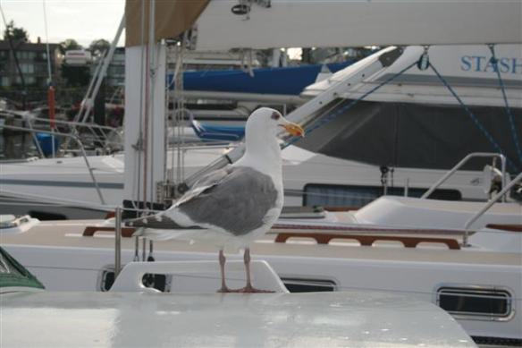 Once upon a time, ( i love starting out that way), there was and still is , a seagull , in Port Sidney marina. His name is Jonathan, yes, like the Jonathan Livingston Seagull, and while we lived in the marina , on G dock, he became a good friend. It all started with me throwing the odd yummy on the dock for him. He caught on fast, and watched our boat all day long. His female , Rosie, was a lot more shy, and kept her distance. We moved the boat to the G 38 slip after a while, which is at the very end of G dock. It was very quiet there, no other people on board, so Jonathan became someone to kind of talk to…..After a while , he would know exactly when i had breakfast, Bert would not be home all week, as he worked in Vancouver, so Jonathan would hop on board, sat next to me at the cockpit, and would take little bites from my food. Lunch time the same, and dinner also, he was never late!!! Many times he would sit on the deck, next to the cockpit, with Annie on the other side, IN the cockpit, just looking at each other, no problem at all. He was very familiar with the galley, thats where the food came from, and he found a spot on the boat next to us,from where he could look into the porthole for the galley. On the weekends, when Bert was home, we would like to and try to sleep in, so we would be past the breakfast time, Jonathan would hop on board, walk to the porthole where we slept , in the aft cabin, look in sideways, like birds do, and start tapping with his beak, and the darn bird would not let up till i got out of bed!!! He loved cheese, especially soy cheese, which is all i could have. I had him as a “pet” for 5 years, hand fed him all the time, but could not touch him. When we moved the boat to Brentwood Bay, i had a pretty hard time with that, and went back every second day, sometimes every day to feed him. He would be waiting at the entrance to the marina, he KNEW i was coming, both him and his mate would run in front of me, all the way to G dock, have you ever seen a seagull run???? it is so funny!!!!!! When we left Brentwood, after two years, to stay in Pender harbour, i had a hard time with it, i tried to wean myself away from him. Since that time, i have been back to Sidney many times, once for my friend Margo’s birthday, which was celebrated in Port Sidney Marina, under the big white tent. And while standing there, chatting with Margo, who flew in but Jonathan, looking at me as if to say, “where is the food”?????? In 2011 we took the boat to Port Sidney to stay on D dock, in a slip belonging to friends, the rigging was all going to be replaced and checked and the mast was to come down. We had barely tied the lines, or Jonathan flew in, up on the dodger, looked at me, as if to say; “well, its about time, where have you been”??????He stayed with us the whole month of July, and i fed him again, by hand, every day, breakie, lunch and dinner. Most people dont think too much of seagulls, find them loud, dirty, but i believe they are very smart, they have an incredible memory, and you can actually teach them things, like ;do NOT poo on our boat!!!! he never , ever did!!!!!! He poohed on the other boats………here are some pics of him, i hope he is doing well, i love him a lot.