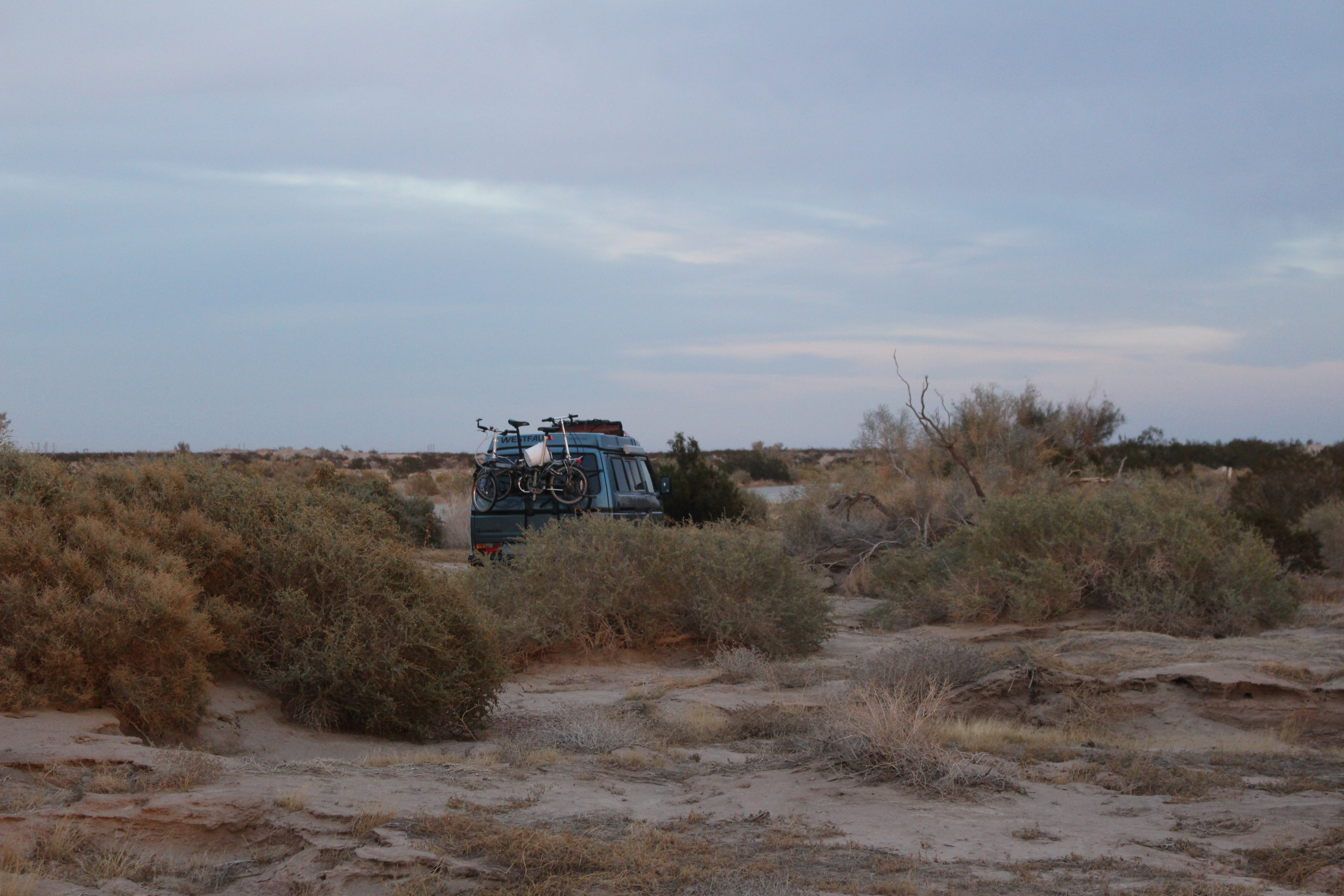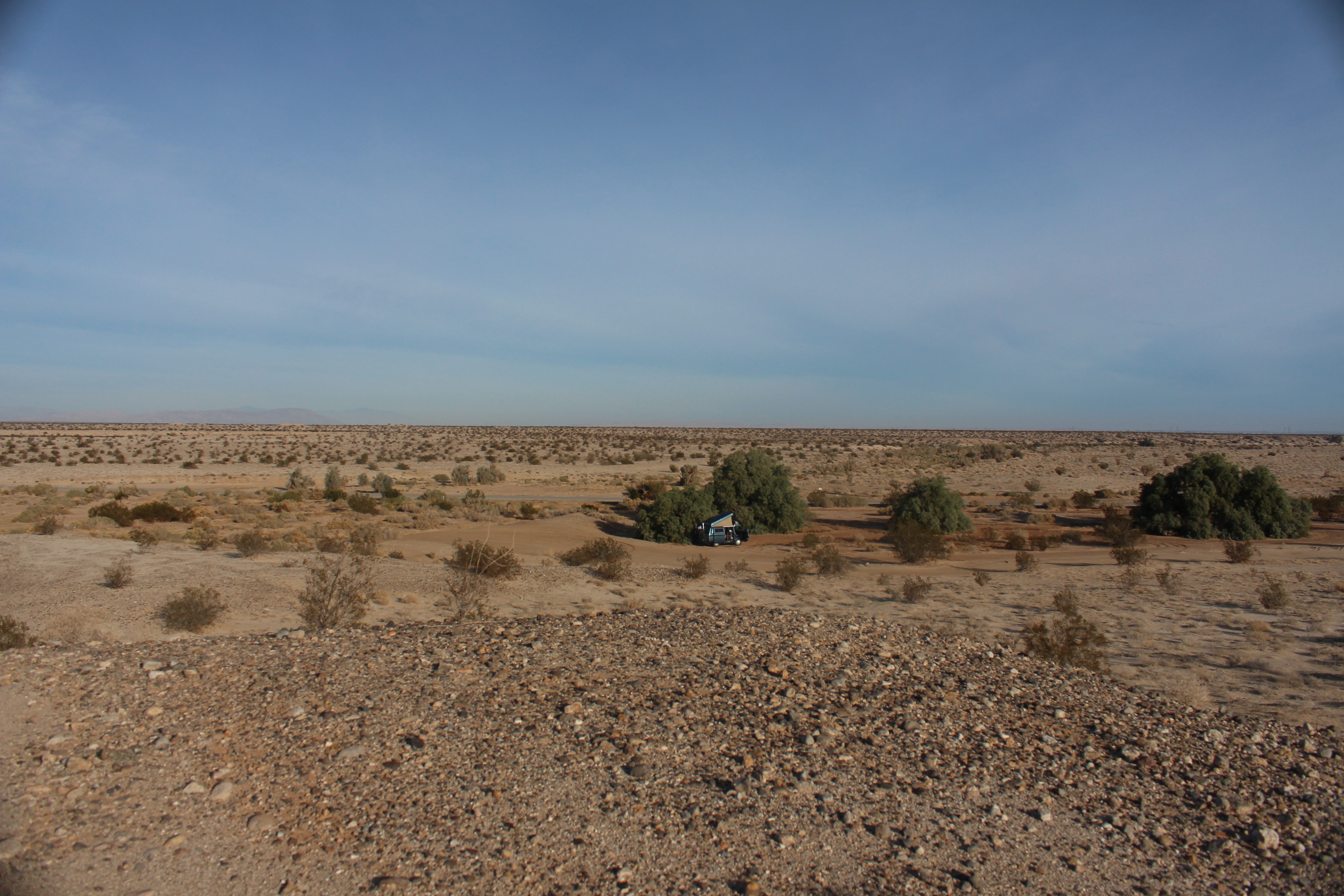 near the Heber dunes , just before Ocotillo, we decided to stop for the day, small dirt roads led off the main track, so we pulled into one, found a small stand of Tamarisk trees, and got our camp ready.