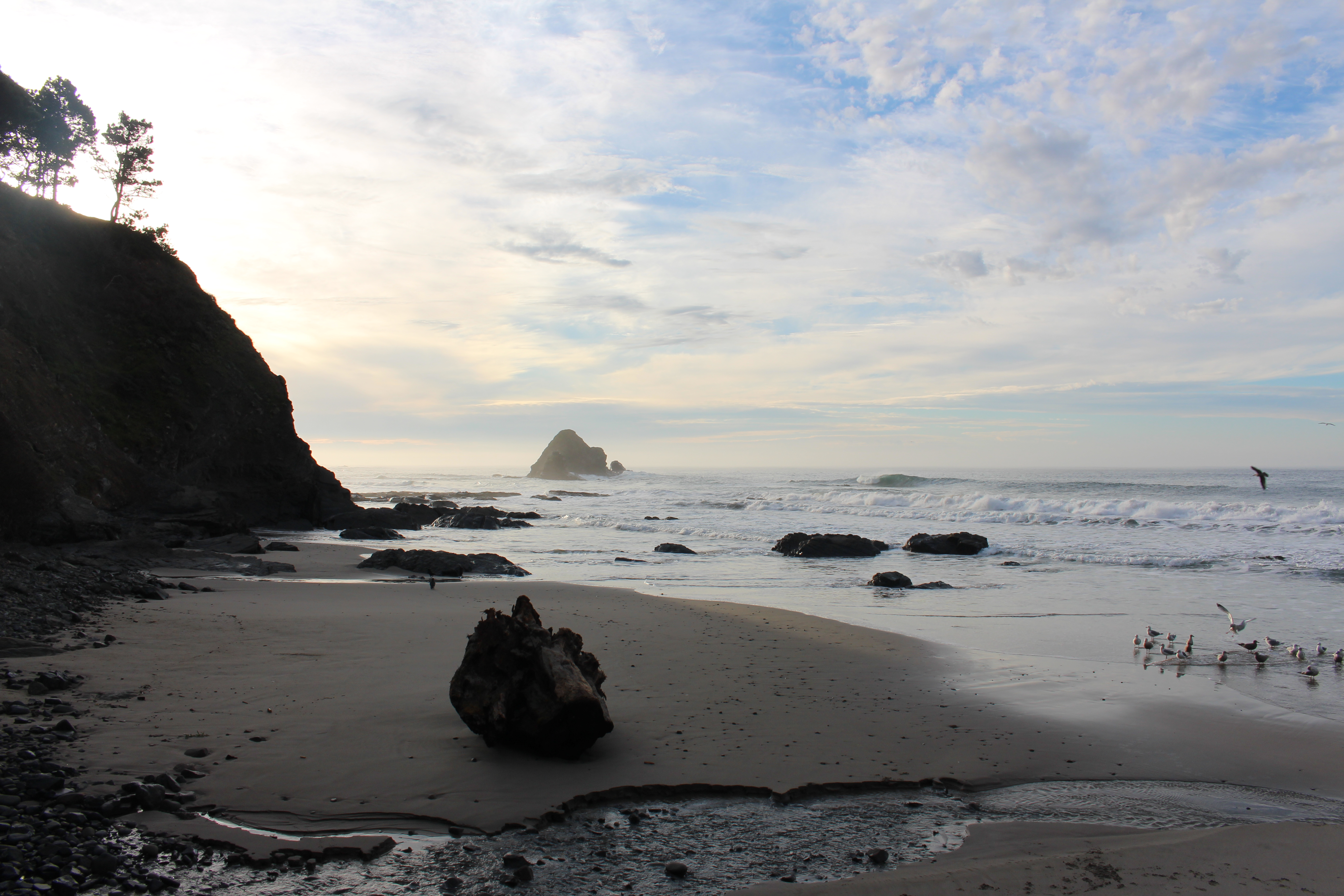 We mostly followed hwy.1 along the coast, leaving San Francisco behind, the weather was mild, no rain, much better then when we were heading South before, i love this road, winding along through farmers fields, old fences, barns, lots of ambiance, the evening light was magical, but it was getting dark soon, the road wound around a deep gully, and below, i looked at a campsite, bordering right unto the beach. Bert kept driving, he had not seen it, but something told me for us to turn and go there, it looked very full with 5th wheelers and rv’s, but right at the water, several spots were available ,so we backed into one, facing the ocean. It was dark by now so we didnt get to meet any of our fellow campers till the next morning.
