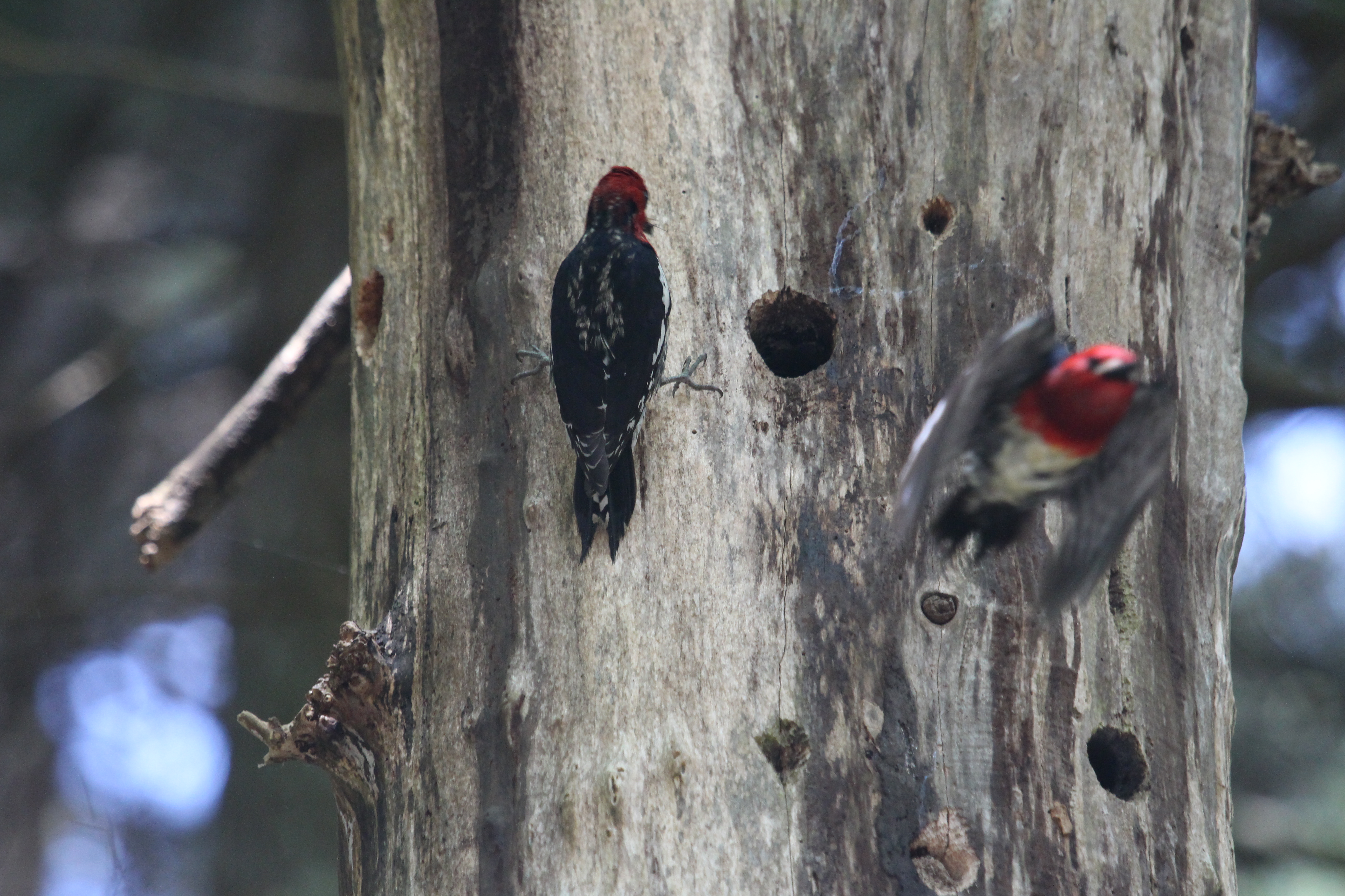 My friends thought the woodpecker parents were pileated woodpeckers, but they are not, the one parent, the male obviously has a very red head, and after some research, i believe them to be sapsuckers, but that still might not be right, tell me what you think!!